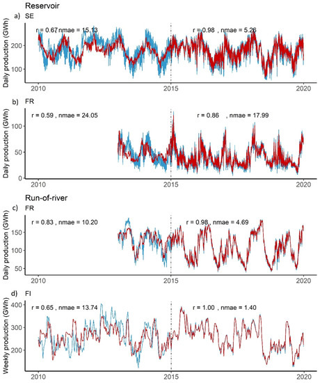 Although the two-step random forest model showed good performance, especially for Spain (Pearson’s correlation coefficient of 0.90 for reservoir-based and 0.98 for run-of-river generation from 5-fold cross-validation), this validation method usually gives optimistic results [16]. One possible explanation is that despite being randomly permuted, the validation dataset in each cross-validation is still an average of multiple random samples from the same dataset, and thus the prediction is not totally independent of the training set. As the model’s skill for extrapolation is important in producing historical (and eventually seasonal forecast, and projections) data, we conducted further tests with additional datasets from Réseau de Transport d’Électricité (RTE) for French hydro power generation in 2013–2014, and from Open Power System Data (OPSD) [17] data for Finland and Sweden in 2010–2014 (Figure 5).