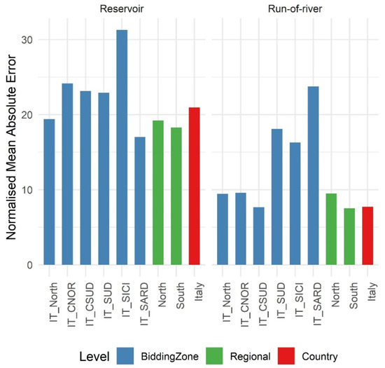 Figure 6 shows the NMAE of the model implemented in these spatial scales. In general, the performance of the model for individual bidding zones is comparable to, or slightly worse than, that at the country level. Notable differences are for IT_SUD and IT_SICI, but especially for IT_SARD, for run-of-river generation. The main reason for this low performance is the very low installed capacities in these zones. Noting that the model performance at the country average level is very good (NMAE less than 10%) and therefore it is difficult to improve on it. It is also interesting to see that when bidding zones are aggregated in North and South Italy, the results are similar to the country average. These sub-country results demonstrate that a highly simplified hydro power model such as that used in our study has the potential to effectively simulate hydro power, therefore offering a credible complement to much more sophisticated physical models.