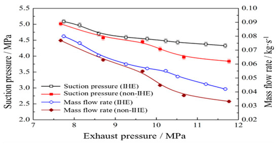 In Figure 2, the mass flow of CO2 of the IHX system is larger than that of the non-IHX system, mainly due to the fact that the suction pressure of the IHX system is higher under the same exhaust pressure. For the transcritical CO2 HPWH system of the constant frequency compressor, the suction pressure is higher and the specific capacity of suction is smaller, so the mass flow rate of the compressor is larger when the same exhaust pressure is used.
