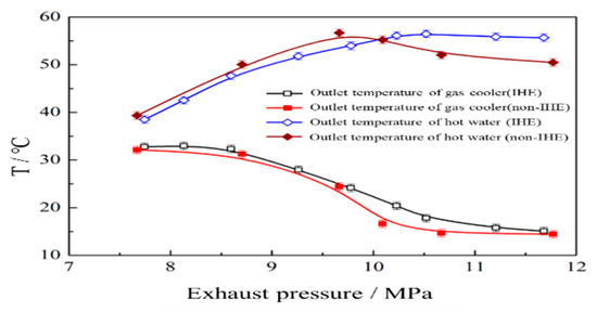 In Figure 3, for the non-IHX system, To-gc decreases continuously as the exhaust pressure increases. When it descends to a certain point, it basically stays the same. Since Ti-hw remains unchanged at 15 °C, when To-gc approaches Ti-hw, it can only approach 15 °C and cannot continue to decrease. For the IHX system, To-gc is decreasing, and as it is reduced to a certain degree, it is also basically unchanged, and the variations of the basic system and the non-IHX system are consistent. The difference is that, when the exhaust pressure is low, To-gc in the IHX system is slightly higher than that of the non-IHX heat pump system. This is due to the fact that the CO2 mass flow of the IHX heat pump system is slightly higher than that of the non-IHX heat pump system.