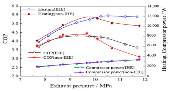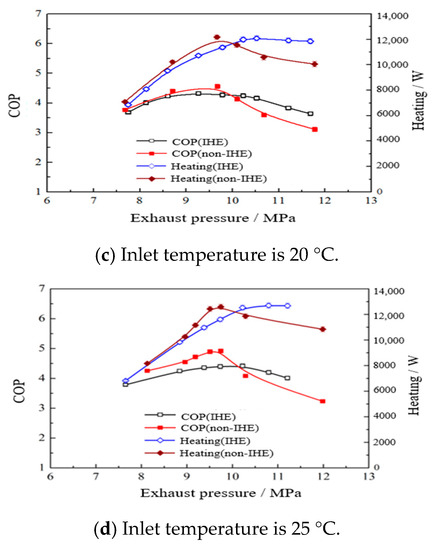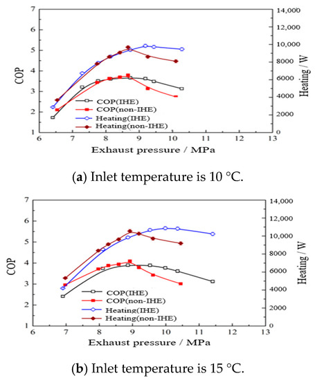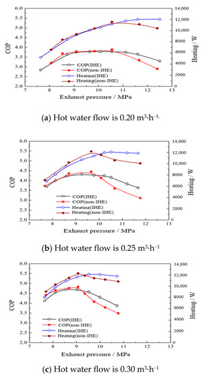 (1) When the Ti-hw was lower (15 °C), the optimal COP of non-IHX system was slightly higher than that of the IHX cycle. When the exhaust pressure was lower than the optimal exhaust pressure, the COP of the non-IHX system was slightly higher than that of the IHX system. When the exhaust pressure was higher than the optimal exhaust pressure, COP of the non-IHX system decreased significantly and was gradually lower than that of the IHX system. At the optimal exhaust pressure, the non-IHX system has higher supercooling, which leads to higher COP. When the exhaust pressure of the basic cycle is higher than the optimal exhaust pressure, the evaporation temperature decreases obviously and is lower than that of the IHX cycle. A decrease in the evaporation temperature leads to a decrease in the COP, so the COP of the basic cycle starts to be lower than that of the IHX cycle as the exhaust pressure increases.