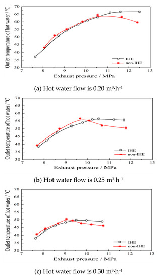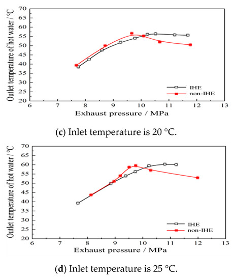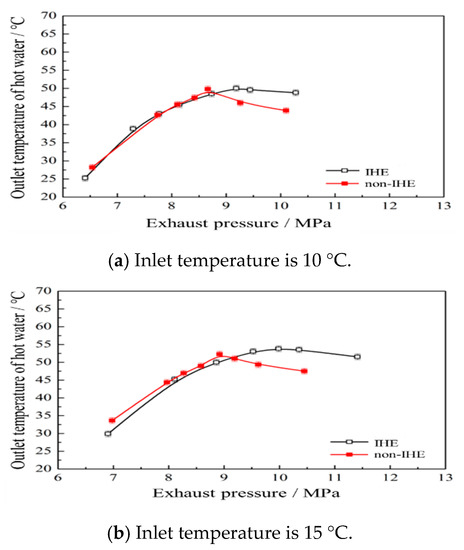 Since the inlet temperature and flow rate of hot water remain unchanged, the change law of To-hw is consistent with that of heating. From Figure 8, as the exhaust pressure continues to rise, To-hw in both IHX and non-IHX systems continue to rise, reaching a maximum, and then gradually decrease.
