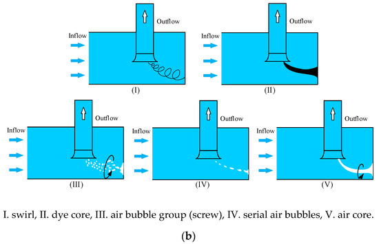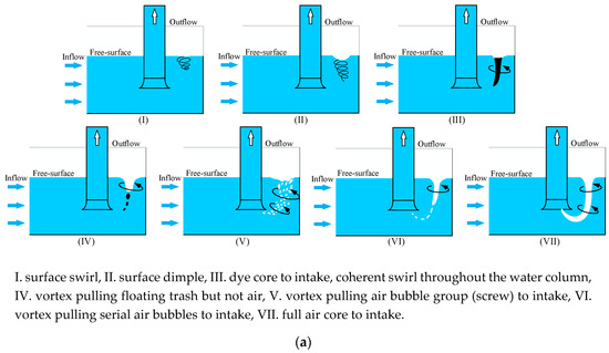 - Chen, Y.L.; Wu, C.; Ye, M.; Ju, X.M. Hydraulic characteristics of vertical vortex at hydraulic intakes. J. Hydrodyn. 2007, 19, 143–149. [Google Scholar] [CrossRef]