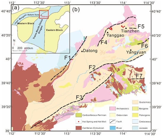 Datong Basin’s basic tectonic framework was formed in Mesozoic. The faulting activities of Datong Basin were mainly controlled by boundary faults, forming a series of grabens and semi-grabens. Tectonic movement is dominated by fault structure, followed by fold structure. The main fault direction is NE, but the local geometry, fracture and movement characteristics of the fracture are complex. Major boundary faults include (Figure 1b): Kouquanshan fault (F1), Liulengshan fault (F2), Hengshan fault (F3), Yunmenshan fault (F4), northern margin fault on Xionger Mountain (F5), southern margin fault on Xionger Mountain (F6), Xiaowutaishan fault (F7), in the same breath, and there may be buried faults in this area [24,39]. In boundary faults, the strike of fault F1 is NNE direction, while that of other faults is mainly NEE. The boundary faults movement in Datong Basin is mainly characterized by vertical movement and extension movement. Only fault F1 has an obvious right-sliding motion component, the depth of the faults in the Datong basin is larger, in which the Hanbuoba basalt is cut in the north of fault F1. Fault structures directly control the distribution of geothermal energy, especially the existence of deep and large faults, which provides a pathway for magma from upper mantle melting to shallow crust. The regional deep-large faults in Datong Basin extend downward and intrude into igneous rock mass along the shallow part of the deep-large faults. There are favorable channels to connect the shallow part with the deep heat source, and transmit the high-temperature materials in deep underground through the large-scale structural faults to the upper stratum. The main direction of the faults activity in the Datong Basin is NE, therefore the direction of heat conduction is also along the NE direction. When the conditions of the upper cover are ideal, geothermal resources can be formed in the northeastern part of the basin.