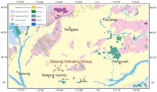 - Deng, J.; Mo, X.; Lin, P. Geological and petrological characters of Datong volcanic group. Earth Sci. 1987, 12, 233–239. [Google Scholar]