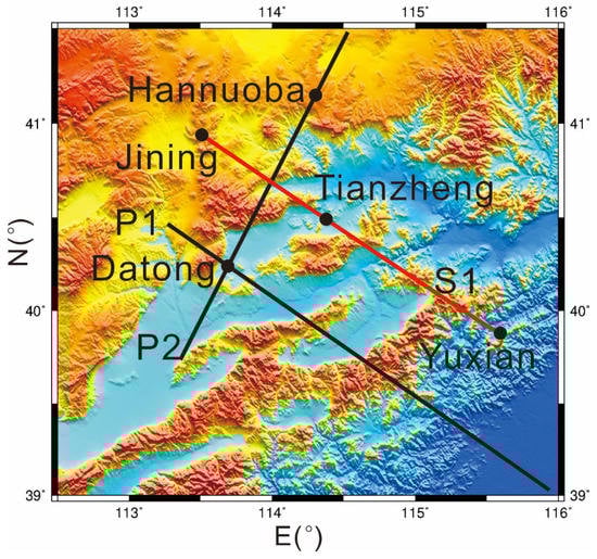 Distribution of MT and seismic profiles in Datong Basin and its surrounding areas. P1 and P2 (black solid lines) are slices of magnetotelluric (MT) three dimensional inversion results [49]. S1 (red solid line) is a seismic line [50].