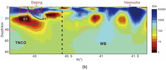 Inversion results of MT (redrawn from [49]). (a) Vertical slice along profile P1; (b) Vertical slice along profile P2.