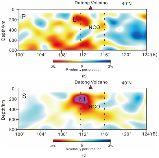 In Figure 6, the profiles indicate that there is a low-velocity anomaly L1 below Datong Basin, which is consistent with the surface wave imaging results in this area and extends downward to the mantle [51]. The local area of L1 shows stronger anomalous amplitude, which corresponds spatially to the surface of the Datong volcano. Temperature and material composition are the two most important factors affecting wave velocity anomaly, and temperature is the most important factor affecting the upper mantle velocity anomaly [31,52,53]. The effect of material composition on temperature is secondary in the depth of 400 km, the low velocity characteristic of L1 is mainly affected by temperature, indicating that L1 has a very high temperature. The researchers believe that L1 may reflect the partial melting of the upper mantle. There is a horizontal mantle flow below Datong basin, causing the mantle to rise and lead to volcanic activity. Investigators [31,54] infer that L1 may reflect the partial melting of the upper mantle below Datong Basin, causing the mantle to rise and lead to volcanic activity. The results of seismic exploration are consistent with those of MT detection in Datong Basin. Under Datong Basin, there are partial melts, which provide a stable heat source for the formation of geothermal resources.