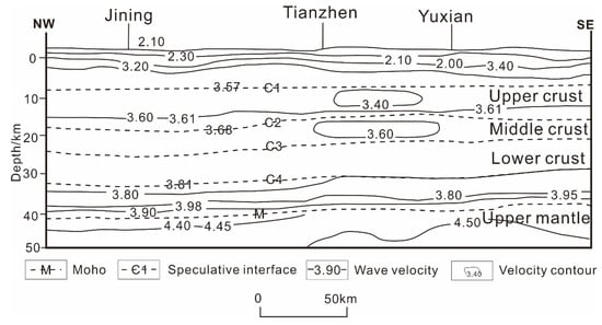 Figure 7 is a seismic profile passing through the northern of Datong Basin (S1 in Figure 4). Profile S1 illustrates the structure and tectonic features of the crust-upper mantle in Tianzhen area. It can be seen that there is low velocity anomaly in the middle crust and the upper crust, which is a separate closed circle, and the low-velocity anomaly is basically distributed in Tianzhen area with high terrestrial heat flow value. The S-wave velocity at the top of the upper mantle has changed significantly, and terrestrial flow value in Tianzhen County is high, and the structure and magmatism are intense, which may indicate the existence of thermal anomalies in the deep. According to the S-wave exploration results, the Moho surface burial depth in the Tianzhen and Yanggao areas of Datong Basin is 38 km, while that in the mountainous areas on both sides is 42–43 km. The hot melting unit of Moho surface uplift zone in the basin is 71 mv/m2, which indicates that there is a stable geothermal source in the lower part of the basin.