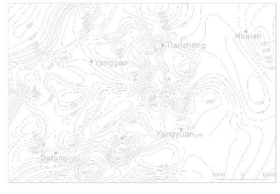 In Figure 8, the magnetic fields in Datong Basin are generally NE-trending, consistent with the basic tectonic framework in the area. According to the regional aeromagnetic data, the Yanggao–Tianzhen area is a disordered magnetic field area. The background field is a positive magnetic field, there are local magnetic anomalies, there are positive and negative anomalies alternating phenomenon, the anomaly intensity is 200–300 nT. Because the basement is cut by Mesozoic and Cenozoic faults into several blocks of different sizes and elevations, the magnetic field appears to be abnormally positive and negative, and several narrow negative anomalies in the area are reflections of fault block collapse. Therefore, it is considered that the delineation range of Tianzhen–Yanggao anomaly is favorable for searching for geothermal resources related to the intrusive rock mass.