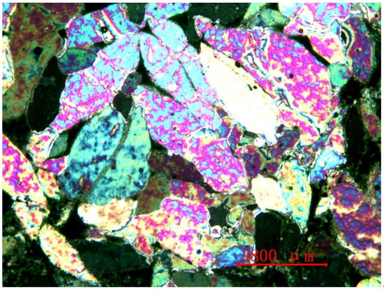 Microstructure analysis was carried out by means of optical microscopy performed on thin and ultra-thin sections of epoxy-impregnated samples. Examination of the material showed that the glauberite minerals exist as granular plate-shaped texture with the grain size mostly between 0.5 mm and 2 mm, and they are distributed non-uniformly in the sample (Figure 2). In addition, the observation of crystal boundary structure and crystal size distribution was done by reflected light- and scanning electron microscopy (SEM), and the glauberite sample’s surface was carefully ground and polished before the examination. Figure 3 shows the shape and size of glauberite crystals, with different scale bars, obtained in the sample.
