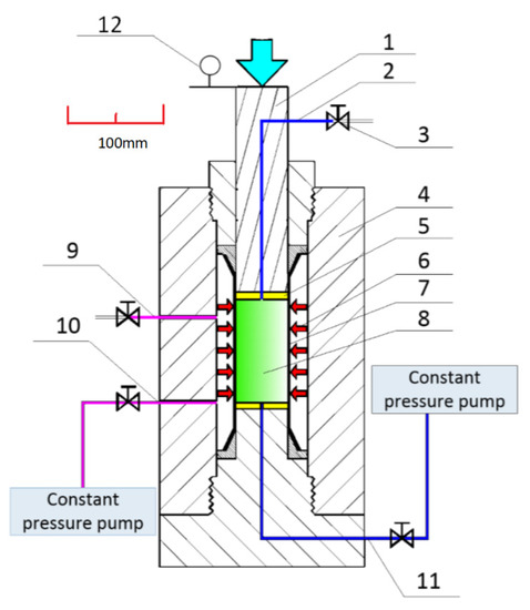 Tri-axial apparatus (schematic). 1—Loading piston, 2—Pore pressure outlet, 3—Valve, 4—Chamber, 5—Porous disc, 6—Confining pressure, 7—Rubber sealing jacket, 8—Rock specimen, 9—Air release outlet, 10—Cell pressure inlet, 11—Pore pressure inlet, 12—Dial gauge.