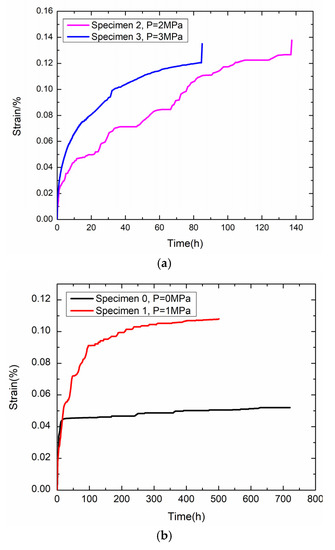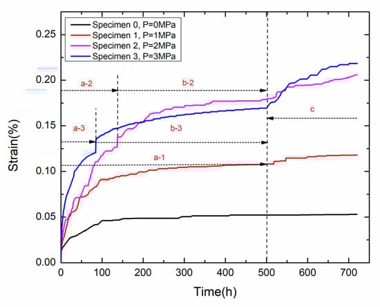Figure 5 shows the strain evolution of specimens 0, 1, 2, and 3 over time during the entire experiment. Within the figures, the letters represent different stages in the time-dependent experiments: “a” denotes hydraulic connection stage; “b” and “c” represent the water-saturated stage and drainage stage, respectively. The numbers of “1”, “2”, and “3” in “a-1”, “b-1”, “b-2”, etc., are specimens 1, 2, and 3, respectively.