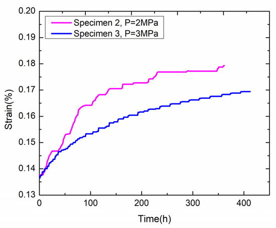Figure 6 shows the time-dependent deformation strain of specimens 2 and 3 over time for infiltration pressures of 2.0 and 3.0 MPa, respectively. It indicates that the two specimens have different time-dependent properties with different infiltration pressures. For specimen 3 with a dissolution and infiltration pressure of 3 MPa, a sharp increase in strain occurred during the time-dependent test even though the strain was small. The axial strain of the specimen increased from 0.12% to 0.135% until the cylinder specimen was hydraulically connected from the bottom to the top face. This behavior showed the gradual softening process of glauberite during the dissolution of the dissolvable components. The original glauberite was intact and hard; however, as the dissolvable components were dissolved with high infiltration pressure, even though this dissolution may be trivial, the glauberite gradually became porous and soft with cohesion decreased. The original solid and stable structure quickly collapsed when this softening accumulated to a certain level. The picture of specimen 3 in Figure 1b after infiltration shows that the deformation mainly occurred at the bottom part where the dissolution and softening effects are stronger. The water dissolution and softening effects vary along the specimen during the infiltration and dissolution process; these effects are obviously stronger at the bottom than at the top of the specimen even at a 3 MPa infiltration pressure. This result indicates that high infiltration pressures and long dissolution times are needed to increase the recovery of the mineral components from glauberite salt rock.