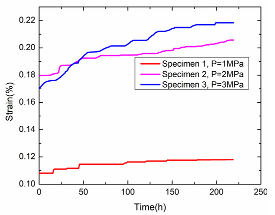 Figure 8 shows the strain of specimens 1, 2, 3 respectively, over time at the design tri-axial stress after unloading the infiltration pressure. The time-dependent deformation strain of specimen 1 increased from 0.108% to 0.118%, and its strain increment was 0.01%; the time-dependent deformation strain of specimen 2 increased from 0.179% to 0.206%, and its strain increment was 0.026%, which is 260% of the strain increment of specimen 1. The time-dependent deformation strain of specimen 3 increased from 0.169% to 0.218%, and its strain increment was 0.048%, which is 480% of that of specimen 1. Contrasting the strain increments of specimens 1, 2, and 3 at this stage clearly reflects the important influence of the loading effect at the previous stage on the internal structures of the three specimens. After removing the infiltration pressure, the pore water pressure inside specimens 1, 2, and 3 decreased to 0 MPa, the axial effective stress increased to 5 MPa, and the effects of the pore water pressure and dissolution and erosion on the specimen vanished. Therefore, the three specimens changed from a state of tri-axial stress and infiltration pressure to a tri-axial stress state only.