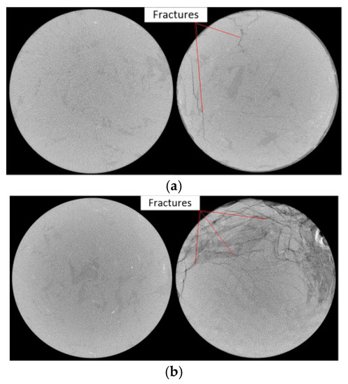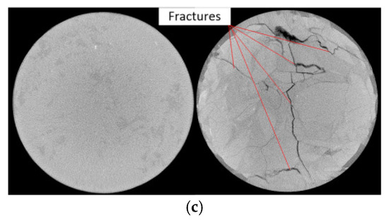 The code compiled by MATLAB [31] was used to reprocess the rebuilt CT images and obtain the porosity. Table 4 shows the porosity and weight of glauberite specimens after versus before testing; it can be seen that the porosity of glauberite specimens increase after testing versus before testing, while the weight of glauberite specimens decreases after testing compared to that before testing. In addition, the porosity and weight loss of glauberite specimens with higher infiltration pressure is larger.