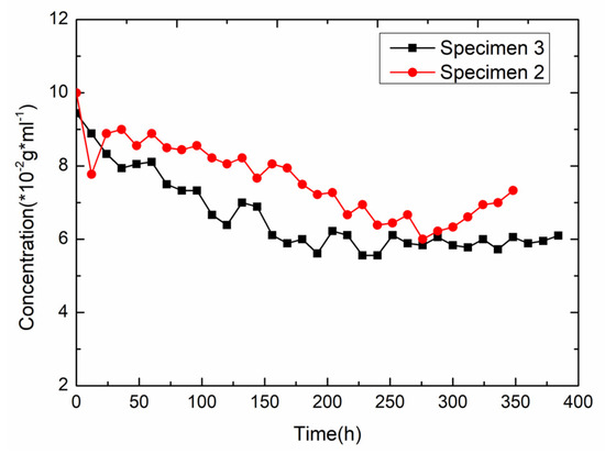 The influence of the solution concentration on the time-dependent deformation properties was not considered in this experiment because the fresh water used for the infiltration pressure was changed regularly to ensure that the solution concentration did not reach the saturation point. However, because solute concentration gradients must have existed in the samples, the solution was likely saturated or near-saturated at many points in the sample. While only fresh water was injected, the concentration of dissolved fluid varied spatially and temporally within each sample, depending on fluid pressure gradient, flow rate, and damage development; therefore, in the experiments, the output concentration of the fluid during the saturation stage was measured by a sodium-specific ion meter, and the results are shown in Figure 10. From the figure, it can be seen that during the experiment the solute concentration did not reach the saturation point.