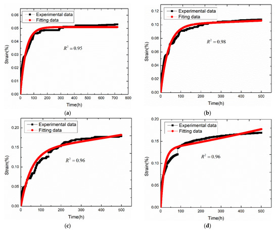 The time-dependent deformation damage constitutive model was adopted to fit the time-dependent deformation strain curves, and the parameters of this model were obtained using the Levenberg–Marquardt algorithm [37]. It should be noted that in this part, we only used our model to fit experimental data at the hydraulic connection stage and saturated-water stage, not including the drainage stage. The model parameters are shown in Table 5, and the experimental data and time-dependent deformation damage constitutive model for the strain-time curves are shown in Figure 12. The results show that the correlation coefficients of the two results are greater than 0.95, illustrating good fit. Therefore, the time-dependent deformation damage constitutive model can depict the time-dependent deformation characteristics of glauberite salt rock under the coupled effects of compression and dissolution.