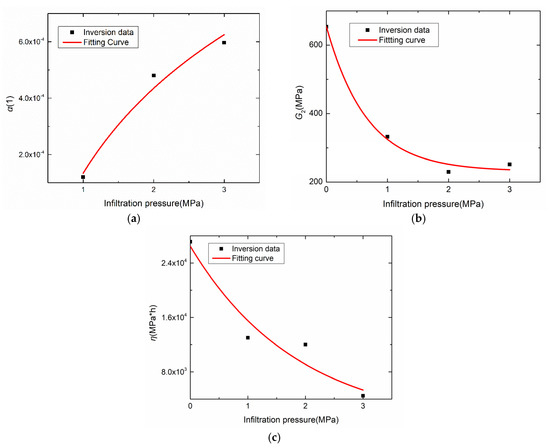 Table 5 shows that viscoelastic shear modulus G2 and viscosity shear coefficient η of glauberite decrease over increasing infiltration pressure when the specimens are affected by the dissolution and erosion effects, while the parameter a increases with increasing infiltration pressure, indicating more damage of mechanical properties of glauberite with higher infiltration pressure. The parameter changes further demonstrate the damage degree of the solid skeleton mechanical properties of glauberite caused by infiltration pressure and dissolution effect. Through the careful analysis, the variation process of these three parameters over infiltration pressure can be described respectively, with Equations (17)–(19).