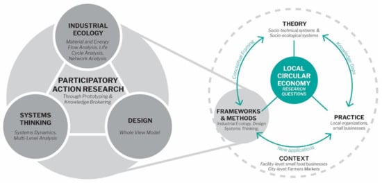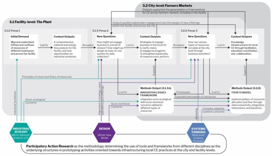 This research utilized mixed methods with participatory action research (PAR) as the primary methodology for engaging with and involving diverse agents to understand and co-create CE interventions, which was an inherently iterative process. Researchers integrated tools from industrial ecology and systems thinking with design frameworks and methods as a means to both gather and analyze different types of data, as well as support collective decision-making about alternative futures with those embedded in the context of research (see Figure 1). PAR reinforces processes of ‘learning by doing’ and focuses on creating an action-learning system for developing practical solutions for complex social problems. It actively engages individuals and organizations embedded in the context being researched during all stages of the research process, ensuring greater involvement and collaboration between all parties, including the preparation of activities, collection, analysis, and synthesis of data, and validation of the outputs [40]. PAR considers that existing knowledge and resources distributed across agents are as valuable in the research process as they are in contributing to the outcomes. The standpoint is that those affected by the research should have a say not only in the research outputs and outcomes, but also in the process [41]. Thus, PAR ensures that individuals and institutions have agency in the research being done about the context in which they are embedded [42], while recognizing their multiplicity of voices, values, and concerns.