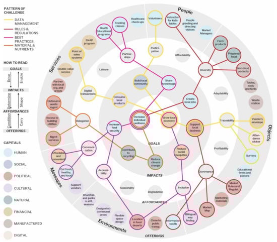 Combined, the experiences at the facility-level (The Plant) and the city-level (farmers markets in Chicago) culminated in the “Four I’s” model, which presents four intervention strategies needed in any process of “infrastructuring” the CE practices in SETS, regardless of its geographic boundary. The “Four I’s” model consists of: (1) interconnectivity between the organizational levels of systems; (2) integration of the social, ecological, and technical systems shaping the conditions in place; (3) interactions of the agents defining the dynamics of these systems; and (4) iteration of design interventions over time [62]. The Four I’s model ultimately presents four general design strategies for intervening in complex CE challenges, such as in urban environments. For each one of these strategies, researchers are exploring a specific tool that can support and advance design practices in these complex spaces.