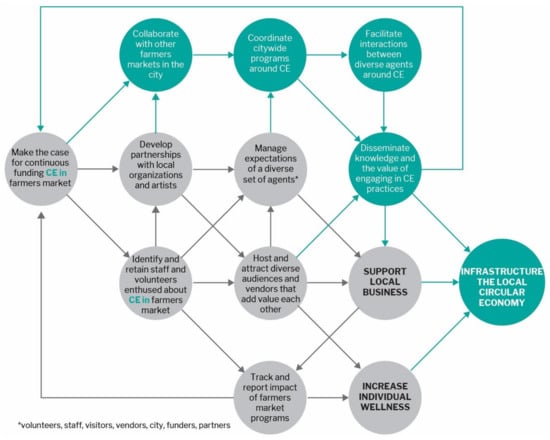 Farmers markets can be characterized as goal-oriented, flexible platforms situated across cities. The POEMS design framework (people, object, environment, messages, and services) defines people (market managers and cleaning staff), objects (wayfinding posters, bins, posters, flyers, tends, etc.), environments (physical space, parking, etc.), messages (information regarding vendors and their produce, incentives to buy local and fresh food, food recipes, etc.), and services (cooking classes, kids tables, prepared food and beverages, live music, etc.) [47,58]. As situated platforms, farmers markets enable the allocation and circulation of various types of resources in urban environments by integrating different production and consumption systems (finance, waste collection, mobility, regulatory, entertainment, food, fashion, health, etc.) that shape and condition various interactions between farmers, local businesses, residents, nonprofits, and government organizations [59]. Yet without proper infrastructures to integrate their efforts into other movements, farmers markets are limited in leading large-scale changes, such as those required to implement CE practices citywide.