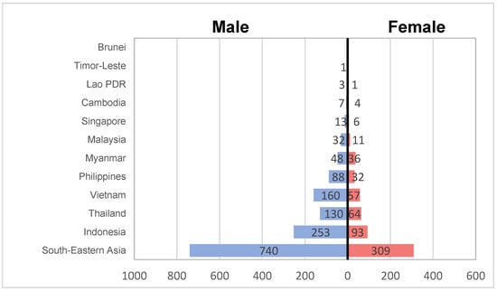 In the ASEAN region, lung cancer is the leading and second leading cause of cancer-related deaths for men and women (after breast cancer), respectively. The age-adjusted death rate for lung cancer mortality is also higher for males compared to females (26.6 vs. 9.4 in 100,000 persons) [31]. The status of gender-adjusted 2012 lung cancer incidence in the ASEAN region by country is presented in Figure 1. During 2016, an estimated age-standardized disability-adjusted life year (DALY) in Southeast Asia showed that 464.59 out of 100,000 individuals are affected by tracheal, bronchus and lung cancer, being more than those who are affected by breast and colorectal cancer combined (Figure 2).