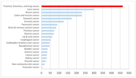 Here, we present some of the studies that are related to air pollution-induced lung cancer. Through the examination of 352,053 new cases of lung cancer, the authors of [29] found that the overall survival (OS) decreased with the elevation of NOx and PMs levels. The authors of [30] recognized that non- and ex-smokers who live in areas near heavy traffic roads show 46% higher rates of lung cancer prevalence. The authors of [4] showed that ambient air pollution is a factor that increases the risk of contracting lung cancer. The aforementioned studies and the IAR identified ambient air pollution as a risk factor for lung cancer. In the following section, we explore the current lung cancer status in the ASEAN region, and then examine the economic burden of lung cancer.