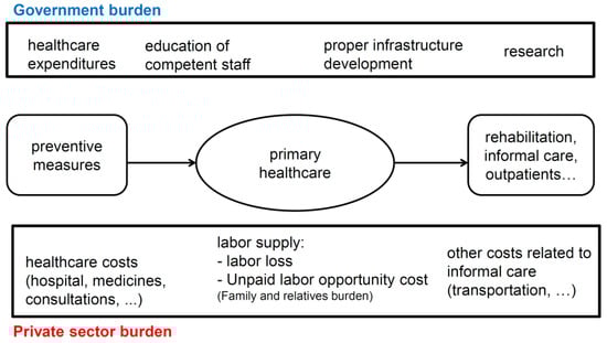 The accessibility of cheap fossil fuels is one of the reasons behind the accelerated GDP per capita growth in Southeast Asia. However, this has a latent cost, which is air pollution and the resulting public health issues, namely, respiratory diseases. There are several costs associated with these diseases, including labor loss resulting from informal care. Figure 3 shows the structure of the costs associated with lung cancer and respiratory diseases, and clarify that both the government and private sector bear these costs. The governmental burden includes the following: spending on healthcare expenditures, education of competent staff, establishment of proper healthcare infrastructure, and R&D using the taxpayers’ money. Meanwhile, the costs that are borne by the private sector are the healthcare costs (i.e., hospital, medicine, consultations, etc.), the labor loss, hidden costs that are often neglected, and other informal costs such as transportation. Labor loss is divided into two parts: the first part is for the patients, who cannot work properly due to a severe disease, and the second part is the opportunity cost of the family and relatives who need to take care of the patients, sacrificing working hours.