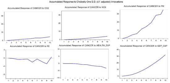 Figure 4 and Table 7 provide the detailed results of the VECM of health analysis, including dynamics between the variables and the variance decomposition. The following ordering of variables is kept throughout the empirical analysis: CANCER, CO2, NOX, PM, RE, HEALTH_EXP, and GDP_CAP. Based on the Johansen’s cointegration results, the number of cointegrating equations is set to one, with an intercept and without a trend. The results of the IRF are shown in Figure 4.