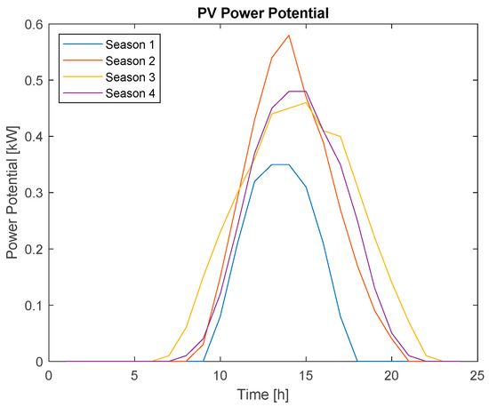 The estimated PV power potential for Toronto, Canada, shown for one day for each season, determined from data gathered from every individual day in each season [46,47].