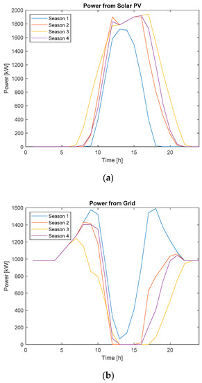 (a) Solar PV power from a 4888.98 kW system; (b) power from the grid for solar PV and grid power case.