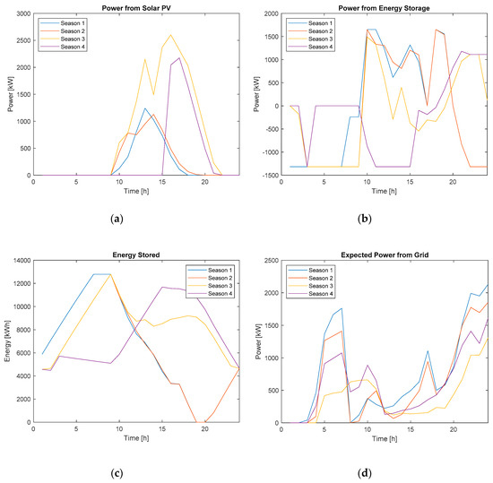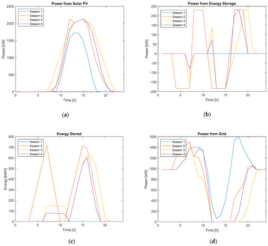 (a) Solar PV power from a 4903.28 kW system; (b) power from energy storage for solar PV, energy storage, and grid power case; (c) energy stored for solar PV, energy storage, and grid power case; (d) power from the grid for solar PV, energy storage, and grid power case.