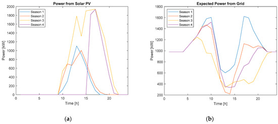 (a) Solar PV power from a 3671.53 kW System for one scenario; (b) expected power from the grid for solar PV and grid power case.