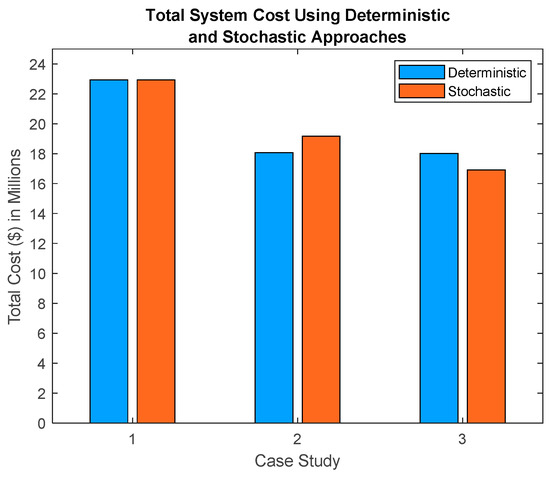 Solar PV potential data was collected over several years for Toronto, Canada and reduced to the 10 most probable scenarios using the scenario reduction technique [48]. Using the 10 scenarios and their respective probabilities, the optimization program was run for the three test cases. A summary of the results from the optimization program using a stochastic approach is presented in Table 7. The stochastic approach did not affect case study 1 as it did not include the use of PV power. Case study 1 is used as a benchmark. The results are analyzed further in Section 4.2.1 and Section 4.2.2.