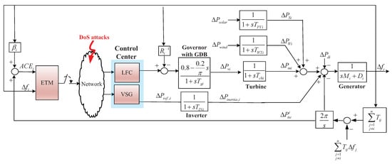 With the penetration of many renewable energy resources, uncertainty and low inertia of converter based renewable energy sources (RESs) bring new challenges for frequency stabilization problem of multi-area power system [1,2]. Since the traditional load frequency control method loses its efficiency, virtual synchronous generation (VSG) concept has been proposed to imitate the behavior of synchronous generators to compensate inertia and enhance frequency stability of power system [3,4]. On the other hand, to increase the efficiency of monitoring and control, network communication techniques have been widely employed to evolve large scale power system to be networked control system. However, the increasing network attacks on power system have brought serious blackout events [5,6]. Researchers have paid much attention to the security problem of networked power system [7,8,9]. As studied, the availability and integrity of information are very essential for the system state estimation and feedback control. However, malicious cyber attacks obstructing information availability and integrity have been launched through DoS attacks and false data injection attacks [10,11]. DoS attacks interrupt communication links among system various components, leading to the missing of transmission packets in times [12], even driving system operation out of stable region. False data injection attacks inject illegal error data into communication network to pollute measurements and demands [13]. In other words, the damage on availability and integrity of information caused by network attack leads to the performance degradation of networked power system [14,15,16,17]. Thus, it is urgent to study secure control scheme to keep frequency performance resilience against DoS attacks or false data injection attacks.