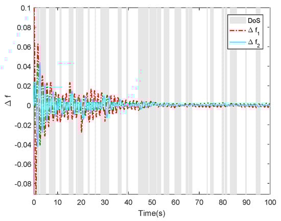 In the next simulation, the influence of communication factors including delay and DoS attacks on power system resilient performance was studied. According to the resilient condition in Equation (14) in Theorem 1, the quantified results show the relationships among exponential decay rate , weight level , DoS attacks parameters and , and delay bound . Note that represents the total duty cycle of attack duration while represents attack frequency. For fixed , other parameters being same as before, the performance indices and are decreased with the increasing of , as shown in Table 3. It indicates that the performance of power system would be seriously deteriorated with the large attack duration . In Table 4, for fixed , the performance level and are increased with the decrease of . It indicates that the high attack frequency would brings damage on the frequency performance of power system. The resulting conclusions are reasonable to meet common sense. On the other hand, although both attack frequency and duration could lead to the performance deterioration of power system, the influence of attack duration is more serious than attack frequency.
