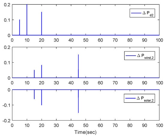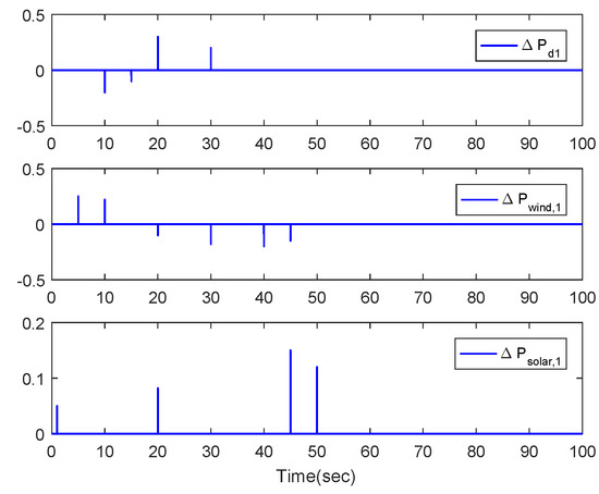 With the solved triggered control parameters, the frequency derivation and the tie-line power exchange of the two-area power system in Equation (5) are depicted in Figure 3 and Figure 4, where the time intervals with grey background represent DoS attacks. Multi-disturbances such as load change, wind farm disturbance and solar farm disturbance are depicted in Figure 5 and Figure 6. It can be observed that the trajectories of frequency derivation and tie-line power exchange approach to zeros after oscillation. By calculation, the decay rate is , which verifies the achievement of exponential stability under our method. The oscillation in the time interval is more serious than that in the time interval even though the former disturbances is less than the latter because DoS attacks frequently occur in the beginning time interval to prevent the implementation of LFC-VSG control signals while the sleep interval guarantees power system restoring much resilient performance against DoS attack in the time interval . Thus, it is necessary to constrain attack frequency, which verifies the reasonableness of our research motivation. On the other hand, the theory value of performance level is . By calculation, the actual performance level is , which is less than . Thus, the power system is exponentially stable with the desired performance level, which verifies the efficiency of our design method.