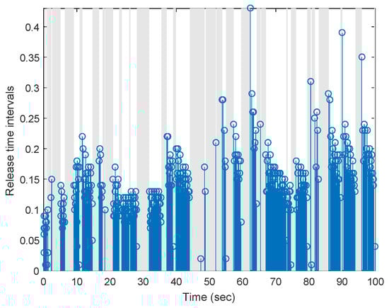 The triggered instants and triggered intervals are depicted in Figure 7. The event-triggered mechanism is operated during sleep intervals while it stops working to save much energy during attack intervals. It can be observed that the average of release time intervals during is larger than that during because the power system with the worse system performance requires many real-time control updates while power system operation in steady state needs low frequency of control update. Thus, the designed ETM can provide an automatic regulation of communication according to the operation state of power system. Compared with the sample time , the transmission rate during sleep intervals was calculated as , which is efficient to reduce the communication load while preserving system performance.