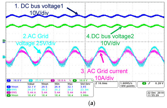 The impact of the load difference is thereby eliminated through the voltage balancing control loop, as simulated in Figure 4a,b, where the load of each PFC is not identical, R2 = 1.1R1. Without balancing control, some diversity of the switch can cause the DC-bus variation. Based on Equations (2) and (3), the same duty cycle will be supplied to two PFCs. Because of the series input structure, the input current will be the same for two PFCs. Therefore, the different load resistance will cause the unbalanced output. The simulation results of the steady-state output voltage waveform without the balancing control is shown in Figure 4a. When the voltage balancing loop is integrated into the control loop, two PFCs can be controlled individually. Voltage balancing loop could compensate for the deviation of the duty cycle caused by the different loads. After the compensation, the different duty cycle generated based on the output voltages of two PFCs will be supplied to the corresponding PFCs, such that the balanced output could be achieved. Figure 4b shows the voltage balancing control performance based on the simulation model. We then further experimentally validated the voltage balancing control for PFC stages, where we consider the load resistances of two PFCs to be 2R1 = R2 = 25 Ω. The experimental setup and the Field Programmable Gata Array (FPGA) control block diagram is shown in Figure 5, and the experimental results are shown in Figure 6. Figure 6a shows the steady-state input and output waveform without the balancing control. It can be seen that the output DC voltage of PFC#1 is almost twice of the output DC voltage of PFC#2. Considering that the load R2 is twice of the load R1, the experimental results are consistent with the theoretical analysis. As shown in Figure 6b,c, after integrating the voltage balancing control, the DC bus voltages are kept the same once the system reaches steady state. Therefore, the voltage balancing control method is validated by the simulation and experiments.
