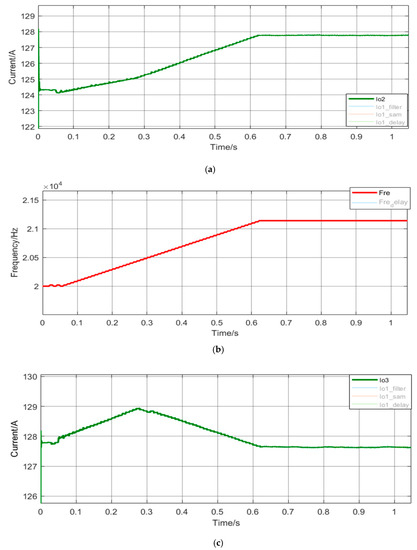 Figure 10 shows the voltage and current waveforms of the transformer primary sides of DCX#2 before and after the DCX reaches the resonant condition. After the DCX reaches the resonant condition, the transformer current waveform changes to a sinusoidal waveform, and the current and voltage are exactly in phase, which indicates zero-current switching-on and -off loss. Figure 11 shows the frequency modulation process of DCX#2 and DCX#3 when the system works under the first set of the parameters of inductance shown in Figure 9a. From Figure 11, we can find that first, the DCX#2 and DCX#3 could modulate the frequency to the real resonant frequency, which is determined by the inductor and capacitor, based on the deviation of the resonant frequency; and second, when the system reaches the resonant condition, the frequency modulation will stop and the controller will keep the frequency constant, such that three DCXs will work on the steady state with balanced outputs.
