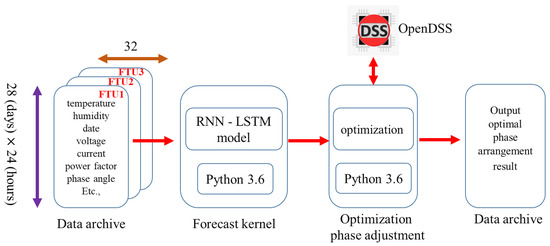 Figure 1 shows the systematical procedure of the proposed approach for reducing the neutral current by optimal rephasing in order to improve the current inefficient phase adjustment manual via report review from a record log of the DDCC. The solution procedure can be divided into three main parts: the front-end database, the forecast kernel module, and the optimal phase arrangement module. The database is responsible for consolidating the calculation results of each module and converting it into a structured query language (SQL) database format, which is stored in a single file. The forecast kernel module uses an LSTM neural network of a recurrent neural network (RNN). The LSTM-RNN is widely used in electrical load prediction, and the results demonstrate its superior load forecasting ability [17,18,19,20,21]. Therefore, the LSTM-RNN is used to predict the real and reactive powers, and then the results are also stored in the database for phase balancing in the optimal phase arrangement module. Details about the LSTM-RNN is described in detail in the following section.