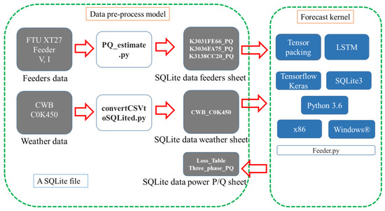 In Figure 1, the front-end processing and forecast kernel internal architecture of the database is shown in Figure 2. The SQL format data was stored in the Forecast_M7.db file. Its contents include the SQL feeder data format, the SQL weather data format, and the SQL power prediction data format. These SQL formats are converted from raw feeder data and weather data by PQ_estimate.py after which the CSV is converted to SQLited.py files. The forecast module is added to the Feeder.py file. The LSTM model training and testing functions were organized with the translator and TensorFlow package of Python 3.6 (Version 1.13.1, Google, Mountain View, CA, USA) and above, and the calculation results were returned to the Forecast_Feeder.db file for storage.