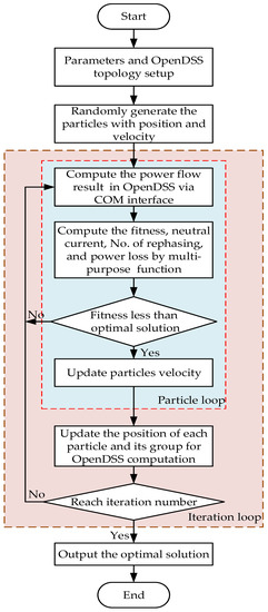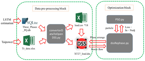Initially, the Electrotek Concepts company developed OpenDSS, a distribution application simulation software. The Electric Power Research Institute purchased it and shared in an open-source manner for research purposes in 2008 [31]. Compared to the commercial software, such as PSS/E (Version 33.4.0, Siemes, Washington, DC, USA) and Cyme PSAF(Version 8.2, CYME International T&D Inc., Quebec City, QC, Canada), OpenDSS has advantages in terms of cost and computation speed despite having fewer functionalities. This study, with an open-source Python computer language, is dynamically linked to the OpenDSS via the COM engine interface to implement the PSO algorithm and derive the optimal phase arrangement outcome. Figure 6 illustrates each process block and the flow direction.
