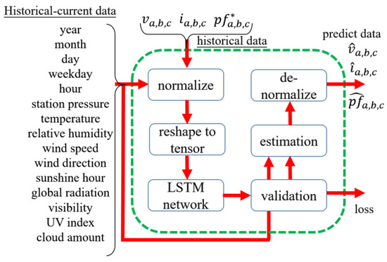 LSTM algorithm applied to the Li-ion batteries charging application and PV plant output forecast in Chemali [27] and Ospina’s [28] study, respectively. This study made the LSTM algorithm forecast the future three-phase power flow according to the weather and time information for the later optimization block process. Tuition materials of the LSTM were recommended in Brownlee’s contribution with the mathematical models, machine learning environment introduction, example codes, and question reply in free [29]. In this study, the LSTM solver is mainly described in Figure 4.