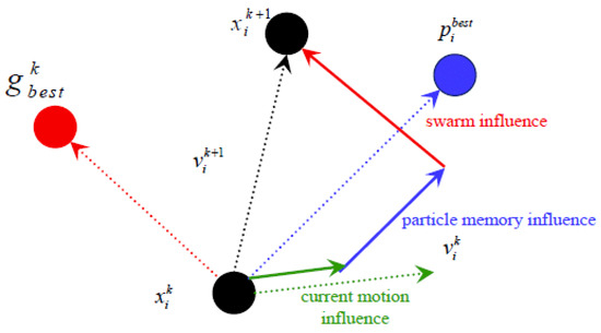 The PSO method imitates the flocks of spicy bird migration and forage behavior, and was originally proposed by James Kennedy and Russell Eberhart [30]. This method observes living creatures and concludes two fundamental behaviors in the migration and forage actions. Figure 5 presents two modes: the cognition-only and social-only modes. In PSO, every entity represents a particle that potentially contains a solution, and each particle also owns its position and velocity information. The movement of each particle updates its direction from the inertia and experience outcomes; this is called the cognitive learning model. When the individual particles are compared with other particles to derive the updated direction result, this process is referred to as the social learning model. Thus, two models iterate and derive the optimal solution. The flow chart is shown in Figure 5, and the PSO algorithm equations are shown in Equations (1) and (2) below.