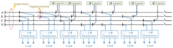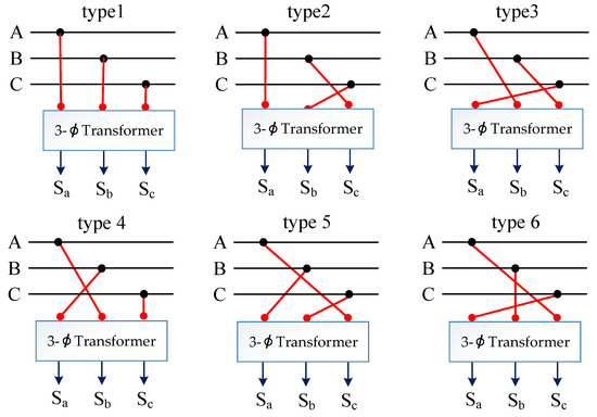 As mentioned above, the practical three-phase, four-wire distribution systems exhibit unbalanced operation caused by the asymmetrical structure of power line arrangement and distribution transformer, DER penetration, and random power consumption of customers. This unbalanced condition results in the serious malfunction of the protective relay, extra power loss, derating motor torque, and degraded power quality. The phase arrangement process changes the physical connection between the individual distribution transformer or lateral and tapped-off point in feeder main. In this paper, the rephasing work was performed in the three-phase feeder main; therefore, the distribution transformers and laterals connected to the feeder main will be the adjusted points. The possible connection schemes for the three-, two-, or single-phase transformers and laterals were different, as shown in Figure 7. For example, Figure 8 presents the six types of connection schemes used in the three-phase connection transformer.