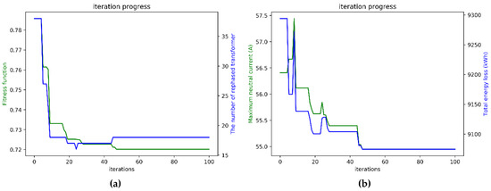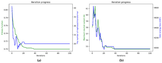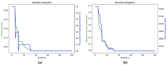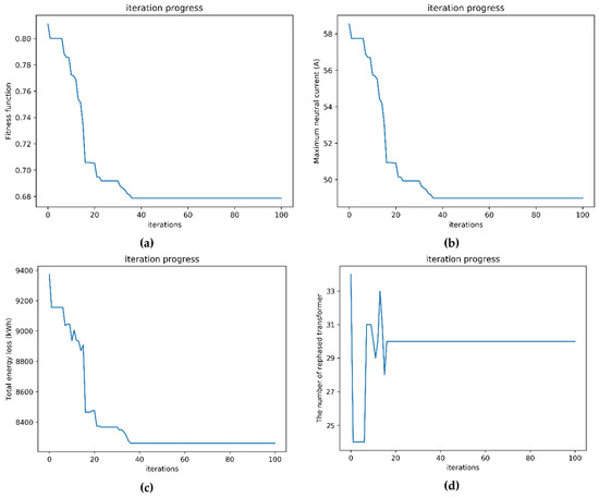 According to the parameters setting in Case 1, in which the neutral current reduction was only considered, the trends of convergence of the proposed multi-purpose fitness function, neutral current, total energy loss, and rephasing number are shown in Figure 10. The fitness function from the initial value to the global optimum value of 0.678675 was below 40 iterations, as shown in Figure 10a. Moreover, the neutral current was reduced from the original value 72.17 A to 48.98 A, which was below 40 iterations, as shown in Figure 10b. These two convergence diagrams are the same because the fitness function equals the neutral current prediction in Case 1. The convergence trend of total energy loss per month is also similar to those shown in Figure 10a,b due to the phase balancing results in neutral current reduction. Therefore, the power loss is decreased under a more balanced condition. The total energy loss from the initial value of 11,317.21 kWh to the global optimum value of 8261.55 kWh is also below 40 iterations, as shown in Figure 10c. Additionally, the trend of the rephasing number from the initial value to the global optimum value of 61 is below 20 iterations, as shown in Figure 10d.