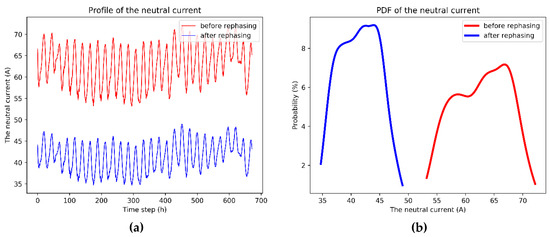 Figure 11 shows the single line diagram of the LCO protective relay in the three-phase, four-wire distribution systems. The current of LCO is formulated as the three-phase current, which is equal to the neutral current. In Taipower, the LCO relay tripping setting limit value is around 70 A, and the LCO detects the neutral current over 70 A to trip the unbalanced short-circuit fault, which then causes the increased tripping setting limit value of the neutral current. Unfortunately, the unbalanced loading can also lead to high neutral current and the malfunctioning of the LCO. In turn, this can cause unexpected interruption and increase the system average interruption duration index (SAIDI) and system average interruption frequency index (SAIFI) of the power company. Thus, supervisory control should be implemented and the neutral current must be acquired. The objective of this paper was to reduce the neutral current by using the proposed approach. Figure 12a,b indicate the corresponding simulation results of the neutral current spread and probability density function (PDF), which was in the front end of the feeder flow into the LCO, before and after rephasing by the full-scale net load model in one month. In the figures, the horizontal axis represents the time in hour (24 h 7 day 4 week = 672 h). The neutral current before rephasing is much higher than that after rephasing; it is over 70 A during some time periods before rephasing but decreased to below 50 A after rephasing. The improvement of neutral current was significant. The neutral reduction before and after the proposed optimal approach can be more clearly seen in Figure 12b. The neutral currents of each line section in the three-phase, four-wire feeder before and after rephasing are illustrated in Figure 13a,b, respectively. The line section numbers from 0 to 50 represent the feeder front to the feeder end. The current unbalanced condition in each line section can also be investigated from these figures.