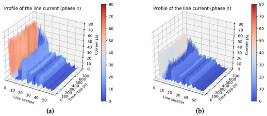 The neutral current profile in each line section: (a) before rephrasing and (b) after rephasing.